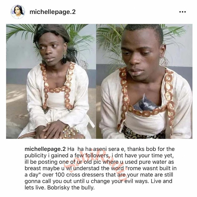 Nigerian crossdresser, Michelle Page has taken a shot at his colleague, Bobrisky after the latter mocked him over his dressing.